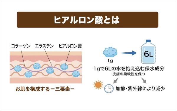 ヒアルロン酸とは:瑞々しいお肌を構成する「コラーゲン」「エラスチン」「ヒアルロン酸」の3要素の一つです。ヒアルロン酸は1gで6Lの水を抱え込めるといわれる“保水成分”であり、皮膚の柔軟性を保つ働きをしています。これらの成分は加齢や紫外線などにより量が減少し、シワやたるみが発生する原因となります。