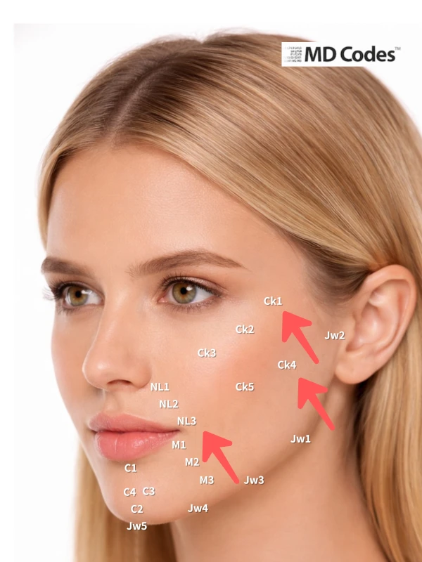 例えば、リフトアップのための注入法として、頬外側(MD コードの CK1 や CK4 )のリフトポイントに注入したのちに、実際のシワに対して、シワを埋める注入を行います。