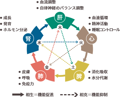五臓はお互いに支配し、支配されながら、バランスを取っています。逆に一つの臓に異常が起きると、相互作用で全体としてのバランスが崩れいろんな部位に症状が出てきます。それぞれの臓が守り合う関係を「相生」、抑制し合う関係を「相剋」と言います。